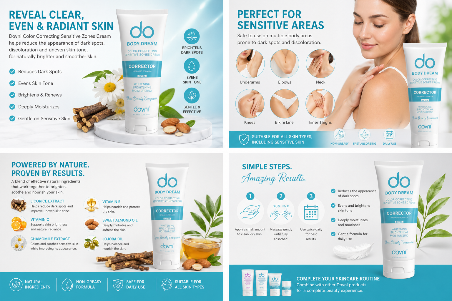 Combine this cream with other Dovni body care products for a complete beauty routine: